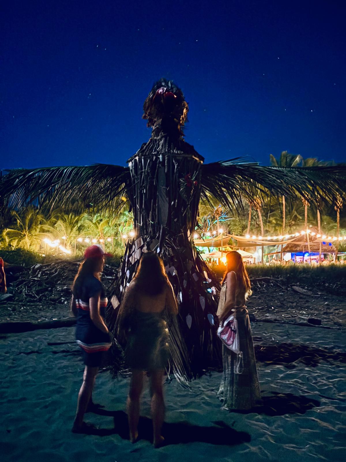 This five meter tall wooden bird was Santa Catalina´s sixth edition of their unique new years eve tradition in which everyone is invited to write their intentions, gratitudes, dedications, or anything they would like to release from the previous year and tie their message onto Burning Woman to go up into the flames. This year their bird spirit carried an estimated two hundred messages with her and had approximately six hundred people in attendance of which about half were nationals, especially Panamanians coming from Santiago due to the completion of the new asphalt road, and the other half being foreigners from all over the world. There were even some Europeans who came to Santa Catalina specifically for this event.