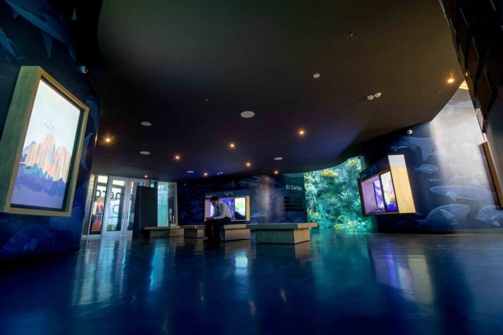• Divided Oceans: Two high-rise semi-cylindrical aquariums show how the Pacific and the Caribbean evolved drastically differently as they were separated by the creation of the isthmus.